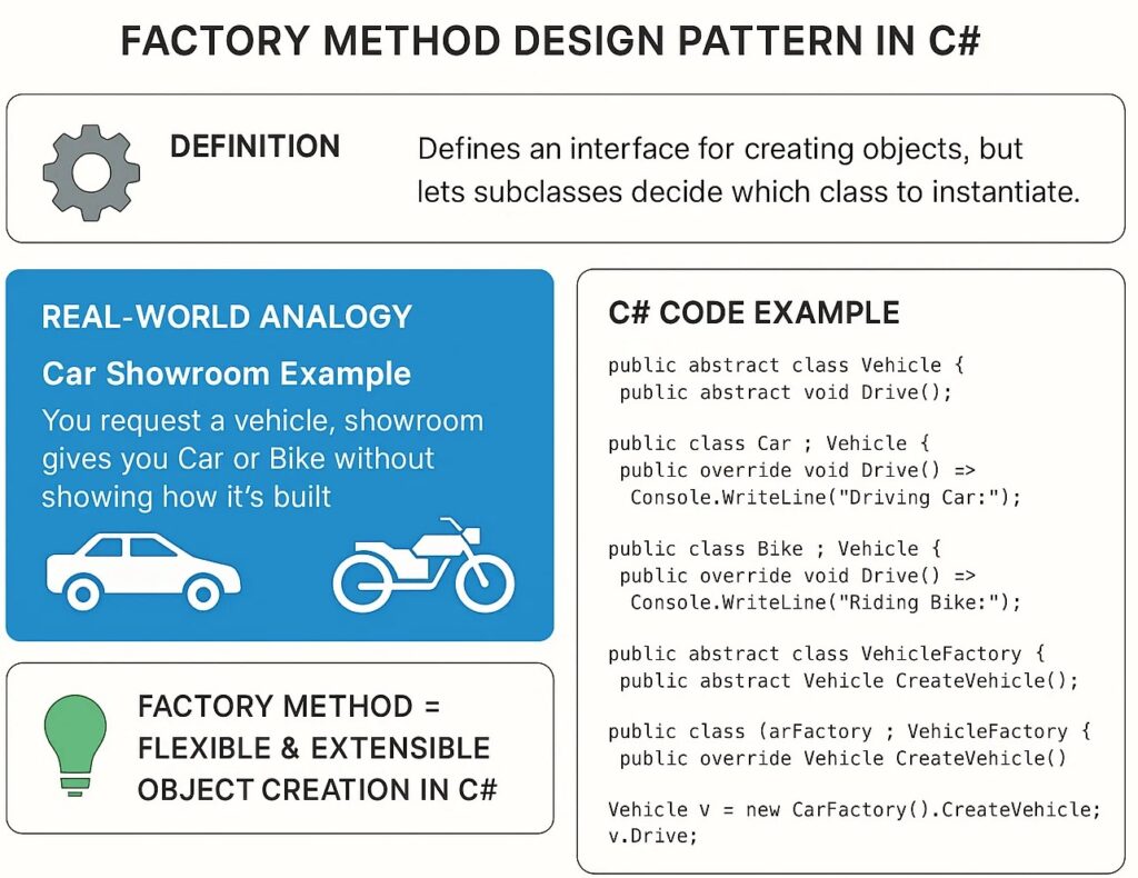 By combining theory, C# code examples, and real-world analogies, developers can master the Factory Method and apply it effectively in real projects.